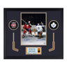 • AJ Sports frame design features dual team logo puck slices, a custom ticket design and decorative cuts showing the highlight matboard.