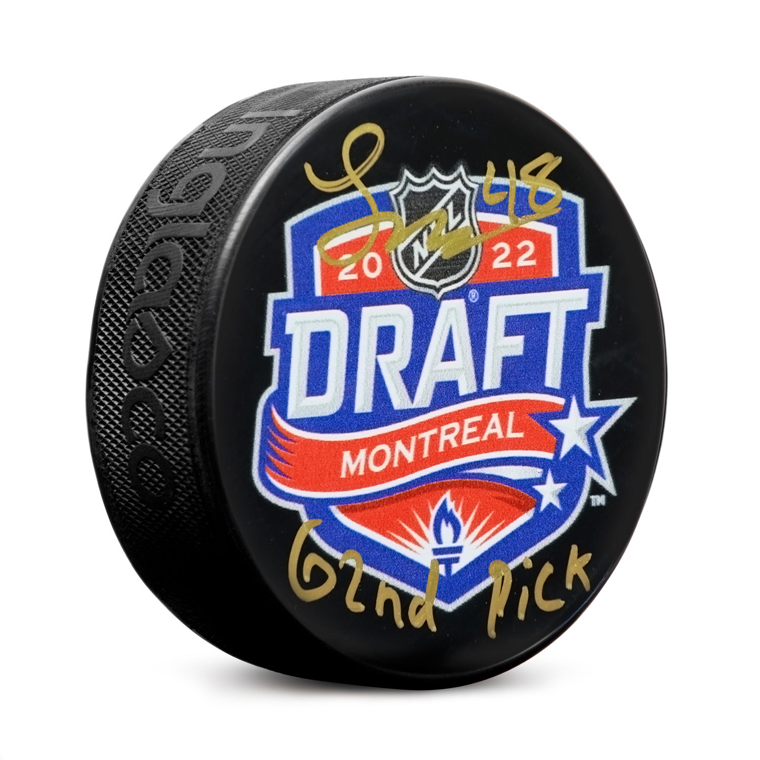 Lane Hutson Signed 2022 NHL Entry Draft Puck with 62nd Pick Note