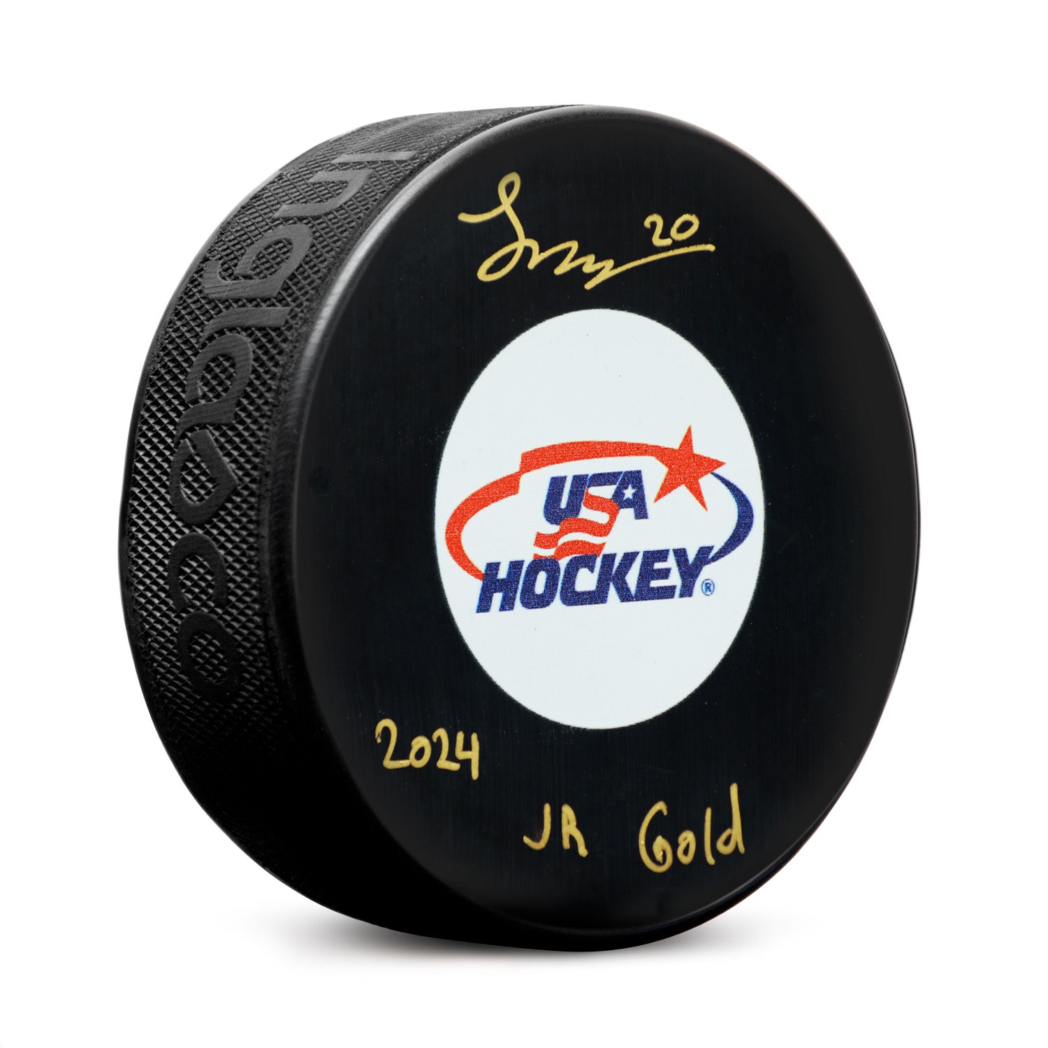 Lane Hutson Autographed Team USA Hockey Puck with 2024 Jr Gold Note