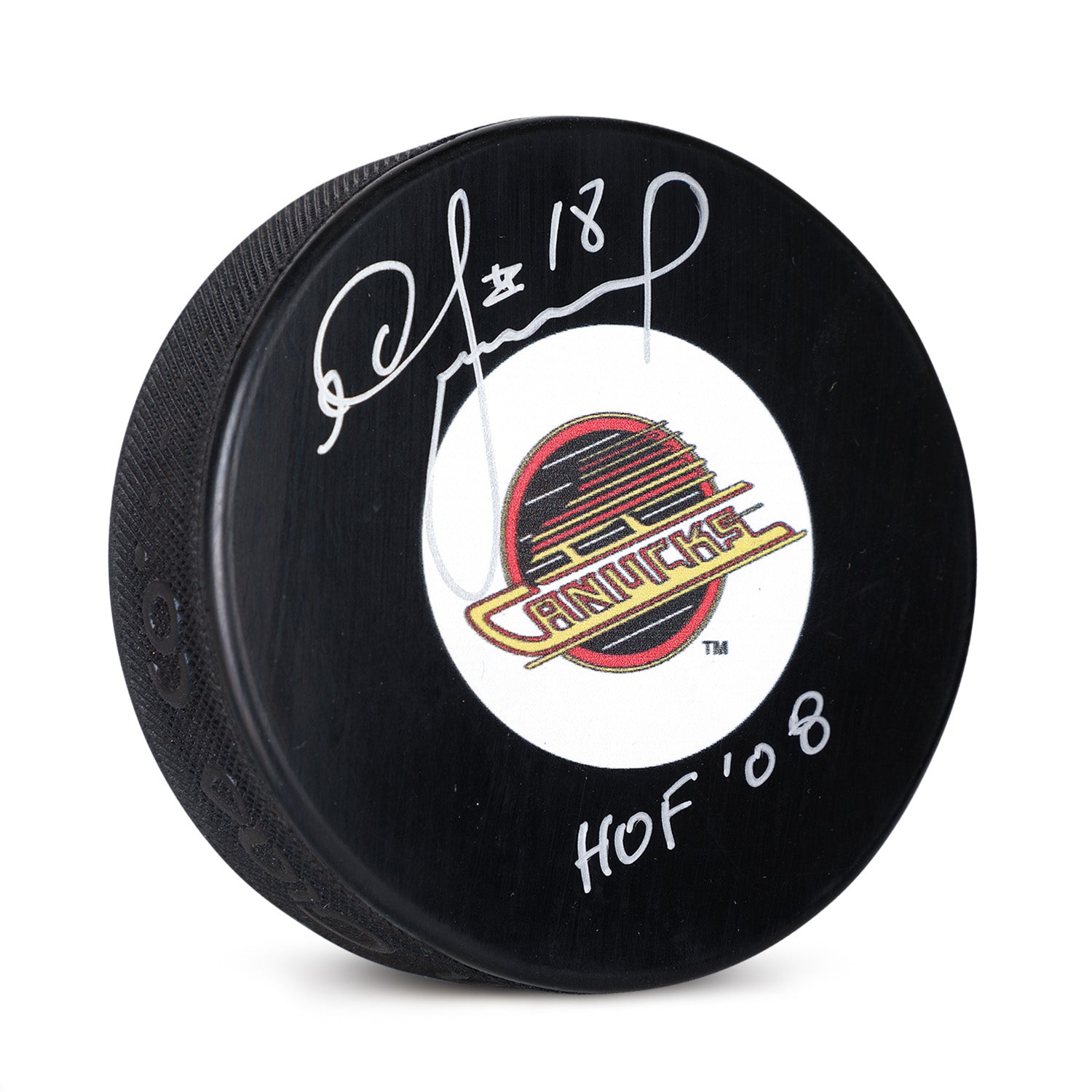 Igor Larionov Signed Vancouver Canucks Retro Logo Puck with HOF Note